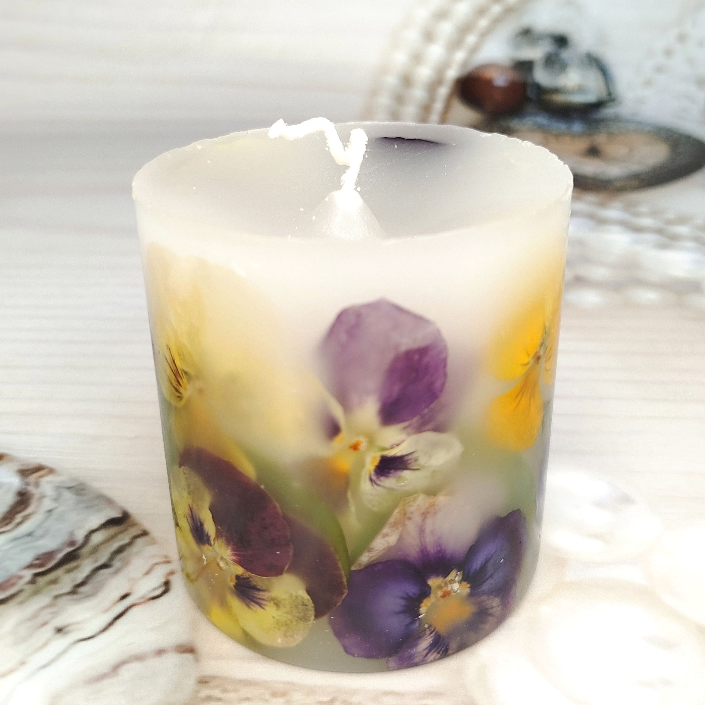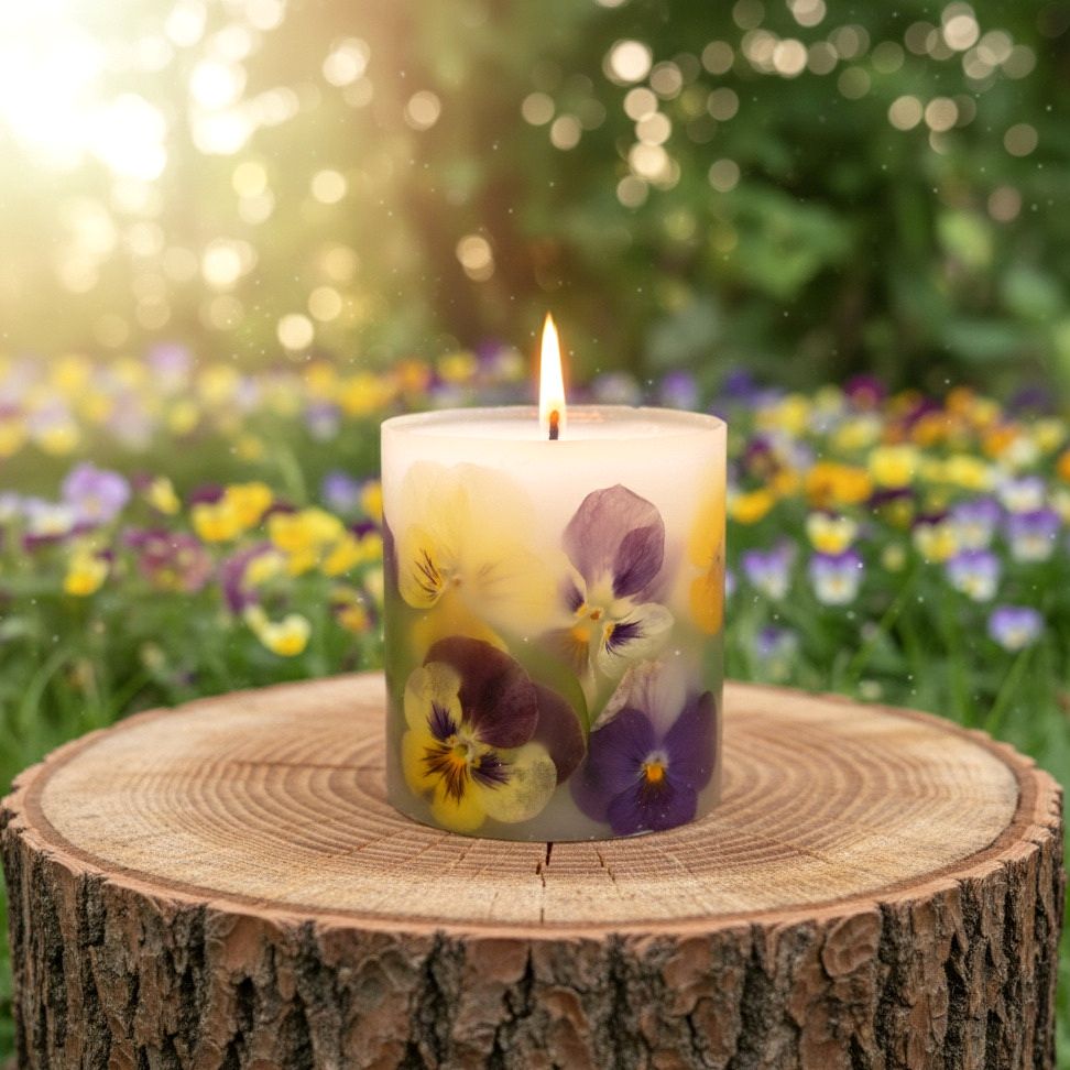 Каждая ботаническая свеча - это маленькое произведение искусства, созданное с любовью. Внутри - настоящие, бережно сохраненные цветы анютиных глазок, которые привнесут в ваш дом весеннее настроение и легкость. Зажгите её, чтобы ощутить тепло и увидеть, как свет оживляет эти прекрасные лепестки.