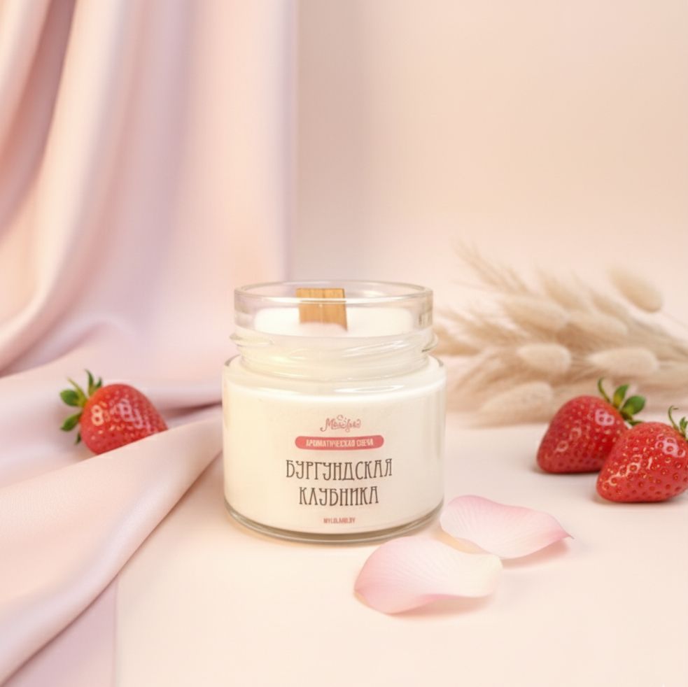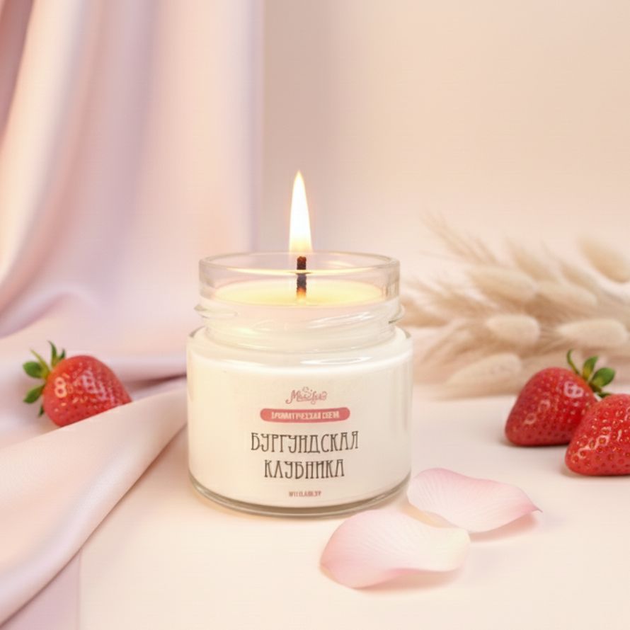 Клубника и Шампанское – ваш идеальный дуэт для праздника души! Ароматическая свеча "БУРГУНДСКАЯ КЛУБНИКА" из натурального 100% соевого воска.