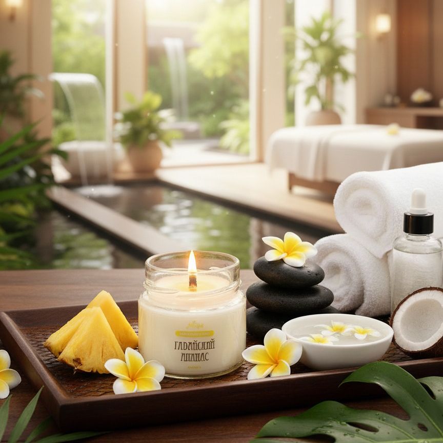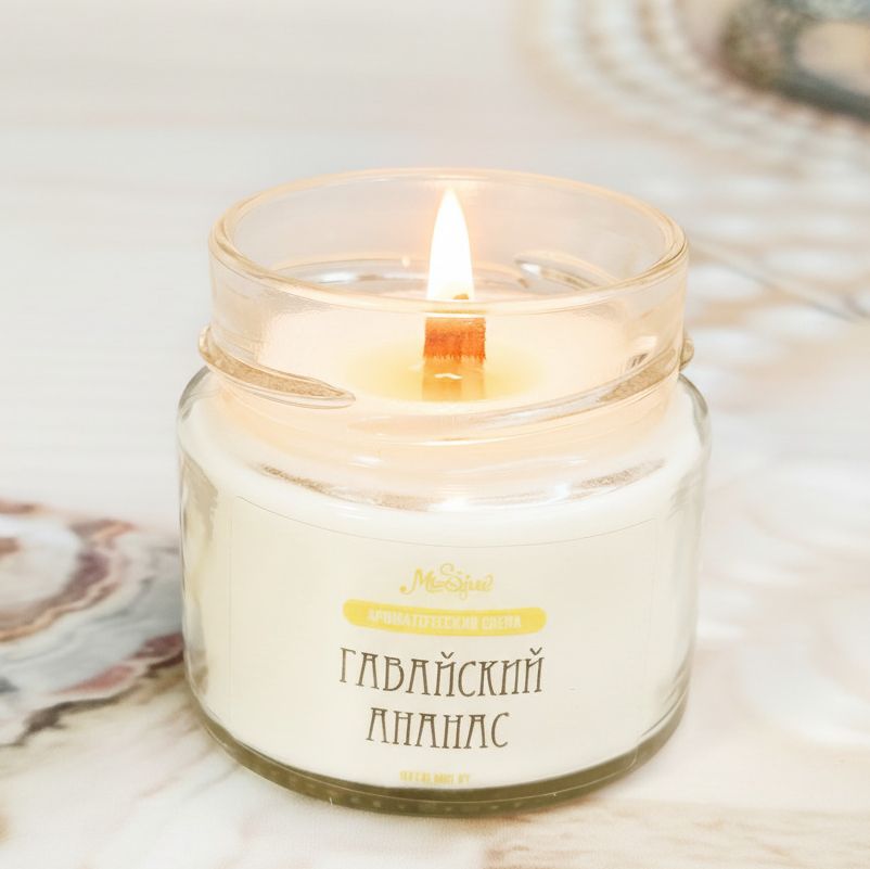 Позвольте себе немного экзотики! Зажгите свечу, закройте глаза и позвольте себе перенестись на Гавайи. Как вам такой способ путешествовать, не выходя из дома? Верхние ноты ананаса, персика и острого грейпфрута сливаются с тропической маракуйей, манго и кокосом. Ноты пикантного лемонграсса и мускуса завершают этот фруктовый аромат. 100% натуральный соевый воск и эфирные масла, включая апельсин (сладкий), сосну, бутон гвоздики, лайм, цитронеллу и петитгрейн.