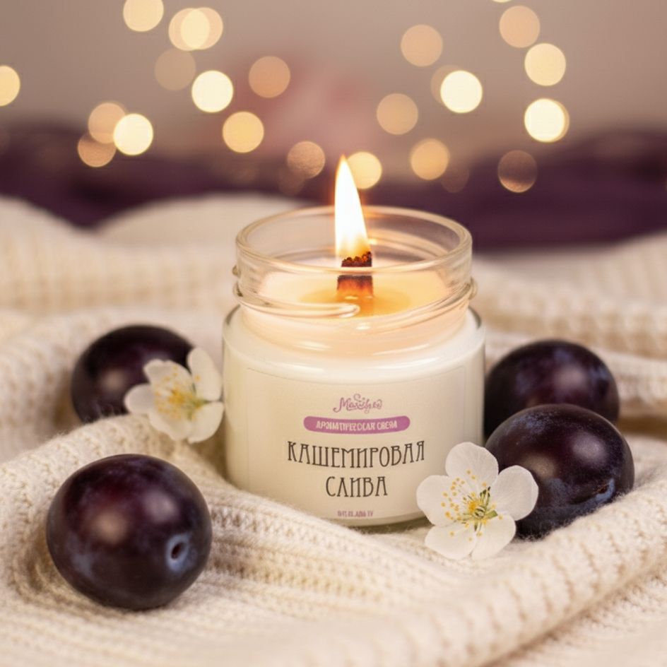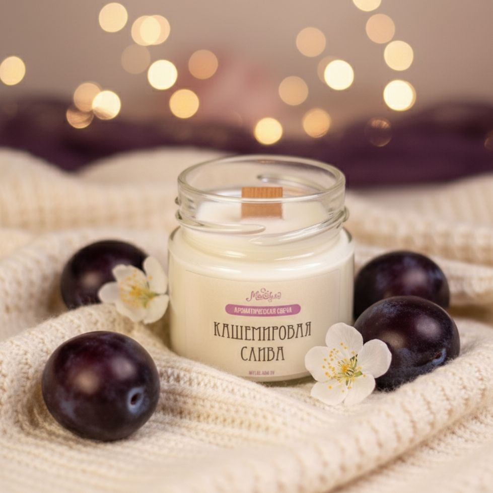 Этот изысканный аромат окутает вас мягким, словно кашемировое одеяло, теплом. Сочная сладость спелой сливы идеально сочетается с нежными, обволакивающими нотами кашемира, создавая атмосферу утонченности и спокойствия. Зажгите "Кашемировую сливу" и превратите ваш дом в оазис комфорта и элегантности. Этот аромат создан, чтобы будоражить чувства, дарить ощущение умиротворения и наполнять пространство теплом.