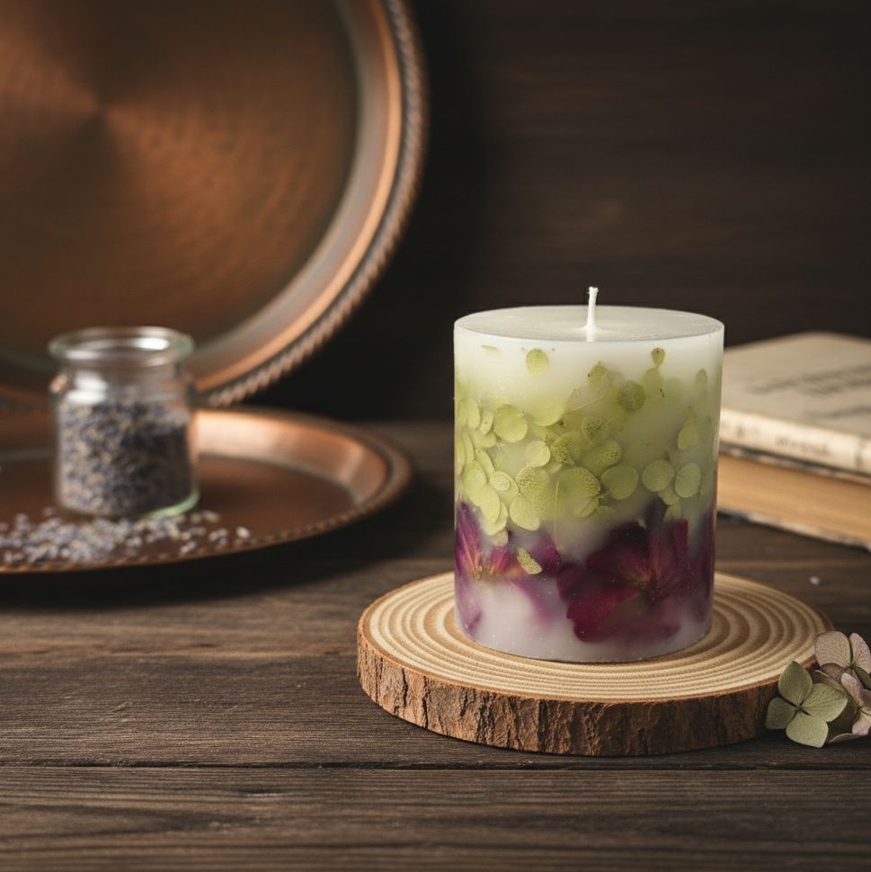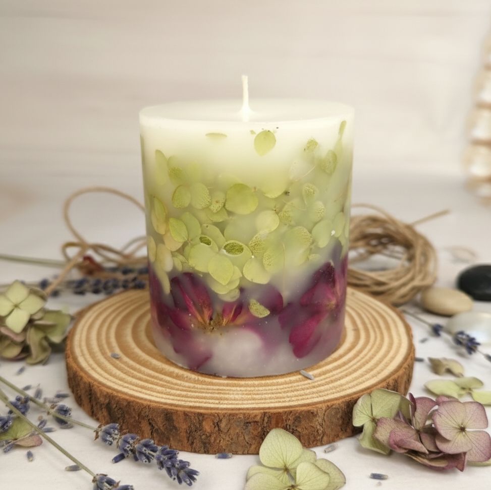 Ботаническая свеча, украшенная бутонами роз и лепестками гортензии.