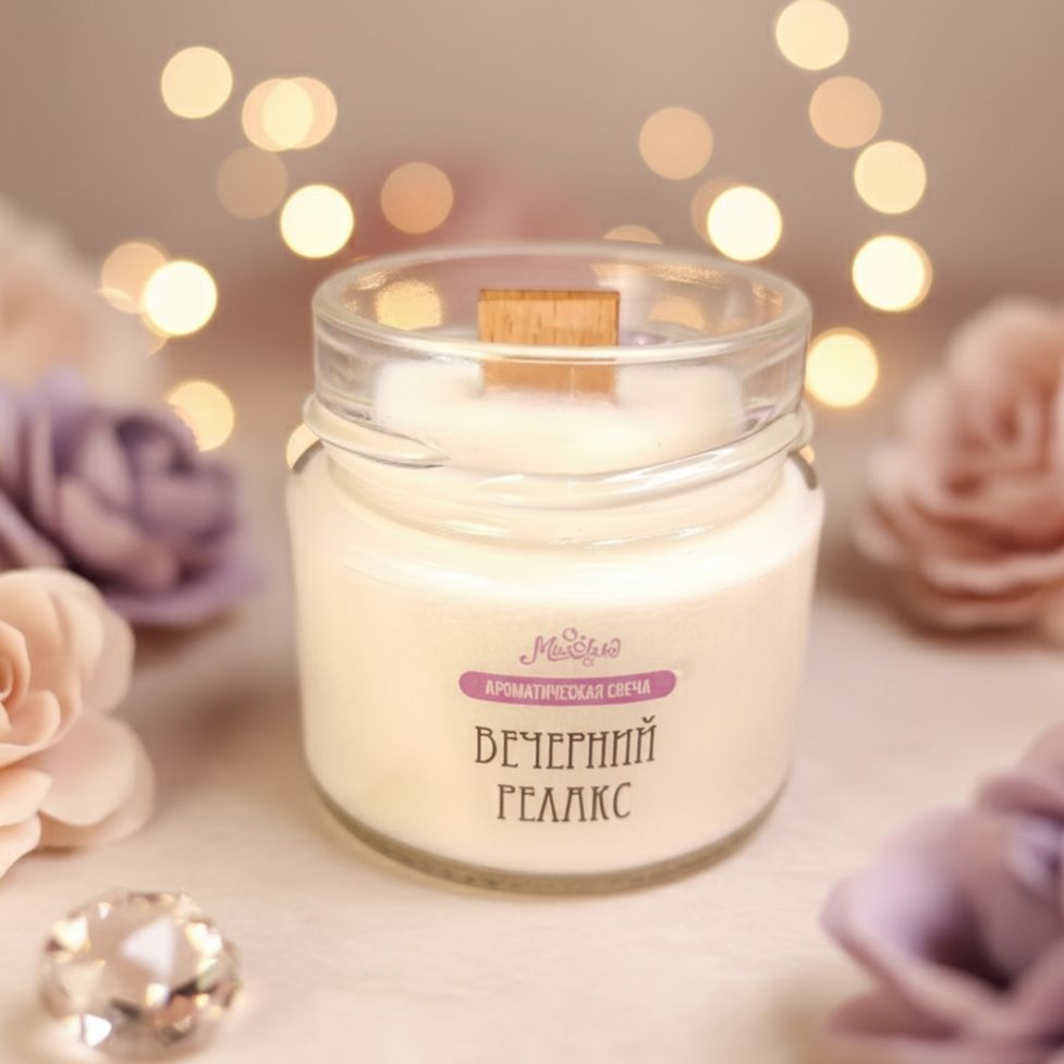Откройте для себя магию "Вечернего релакса"! Успокаивающий и сбалансированный аромат этой свечи - это идеальное завершение долгого дня. Насладитесь гармоничным сочетанием свежего лемонграсса и сочной черной смородины, которые плавно переходят в теплые оттенки пачули и сладкого сахарного тростника. Забудьте о суете и проблемах. Это великолепный круглогодичный аромат, который хорошо вписывается в линию ароматерапии. А как приятно потрескивает при горении деревянный фитиль... Ручная работа. Натуральные ингредиенты.
