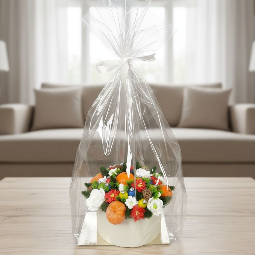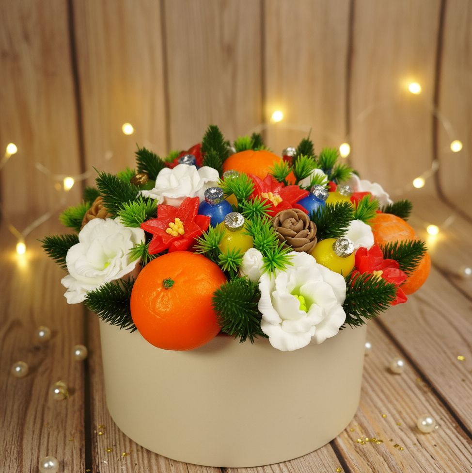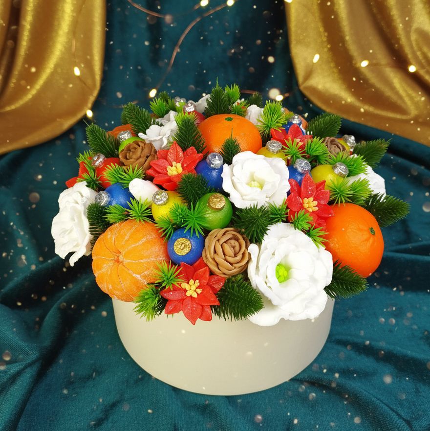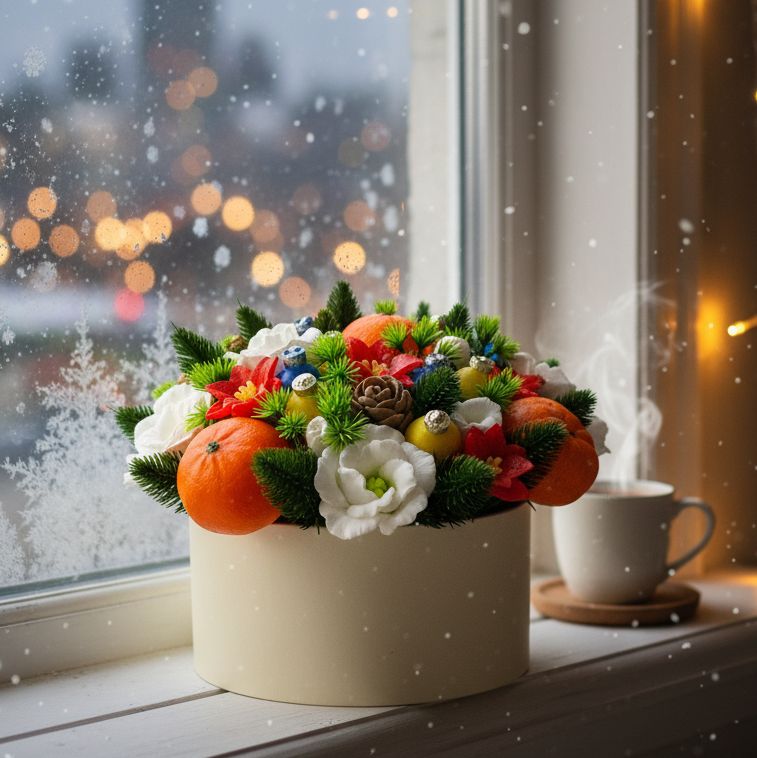 Этот букет — предвкушение самого волшебного дня в году. Сочные мандарины, яркие цветы и пушистые еловые ветки собраны вместе, чтобы создать атмосферу праздника, домашнего уюта и ожидания чуда. Свежий цитрусовый аромат и праздничный декор — все, чтобы ощутить приближение Нового года. Пусть каждый день будет таким же ярким и радостным!