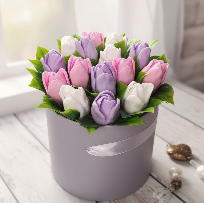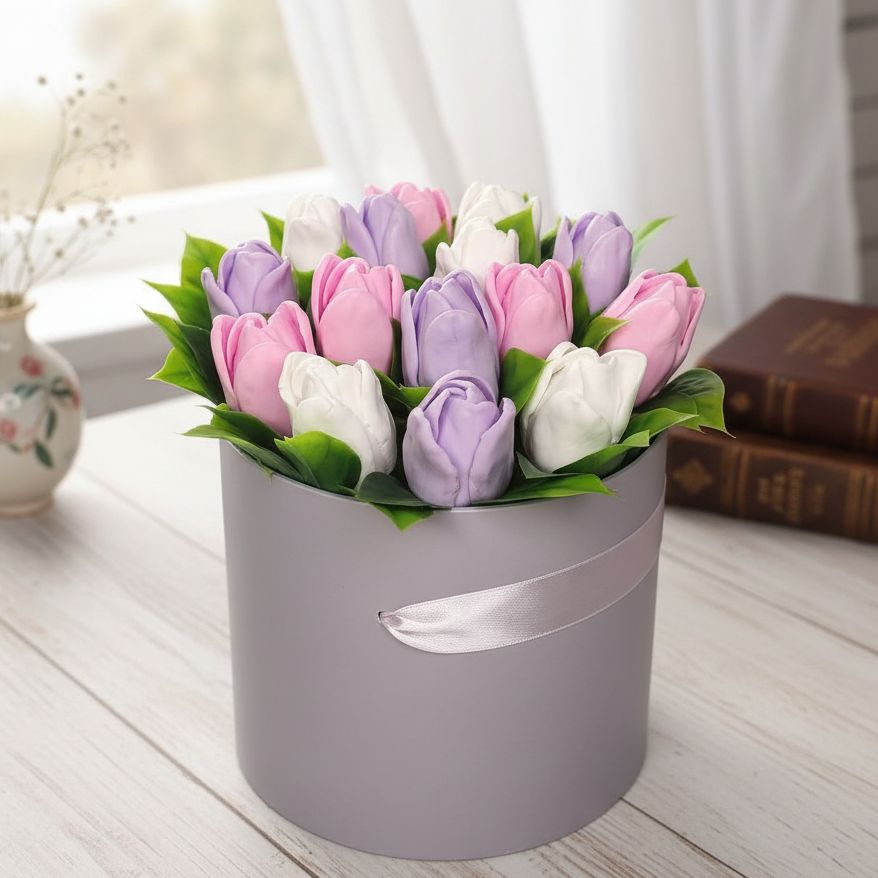 15 красивых тюльпанов нежных оттенков в шляпной коробке с добавлением зелени.