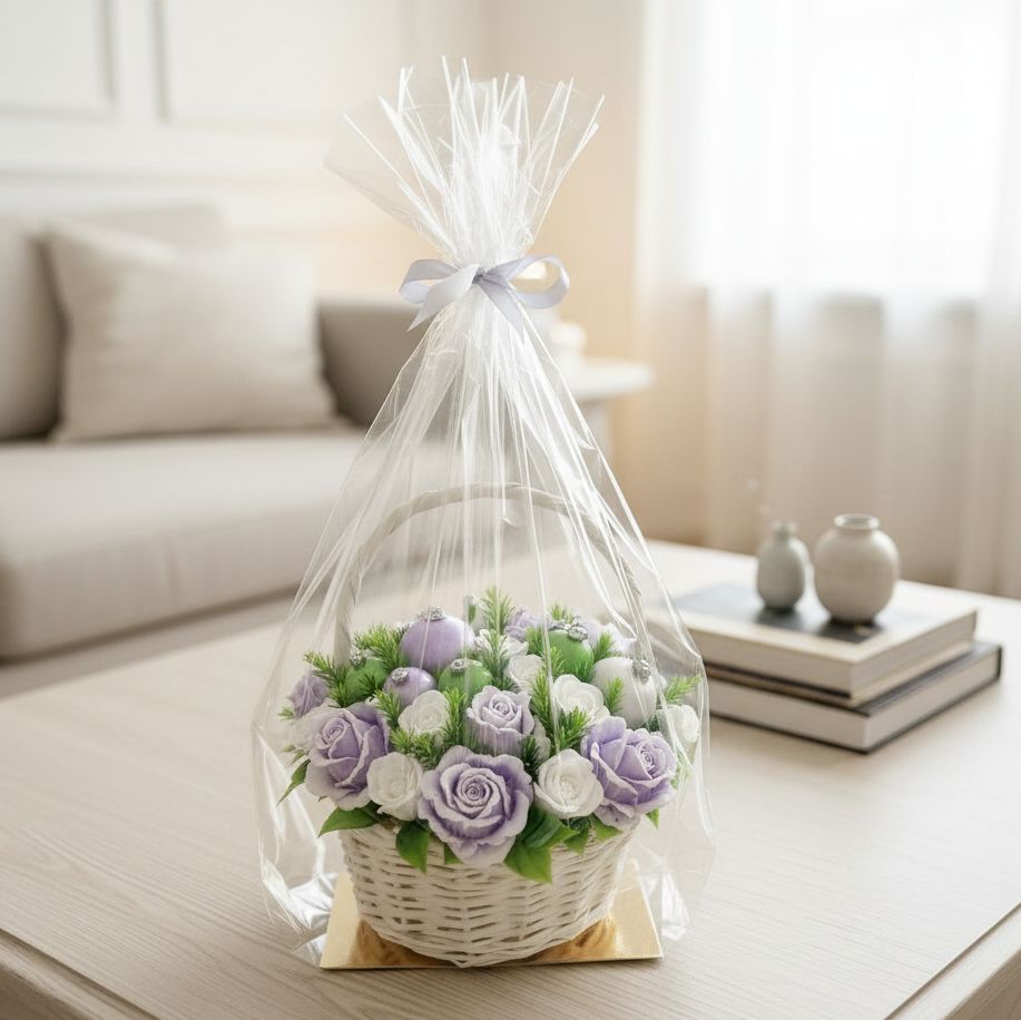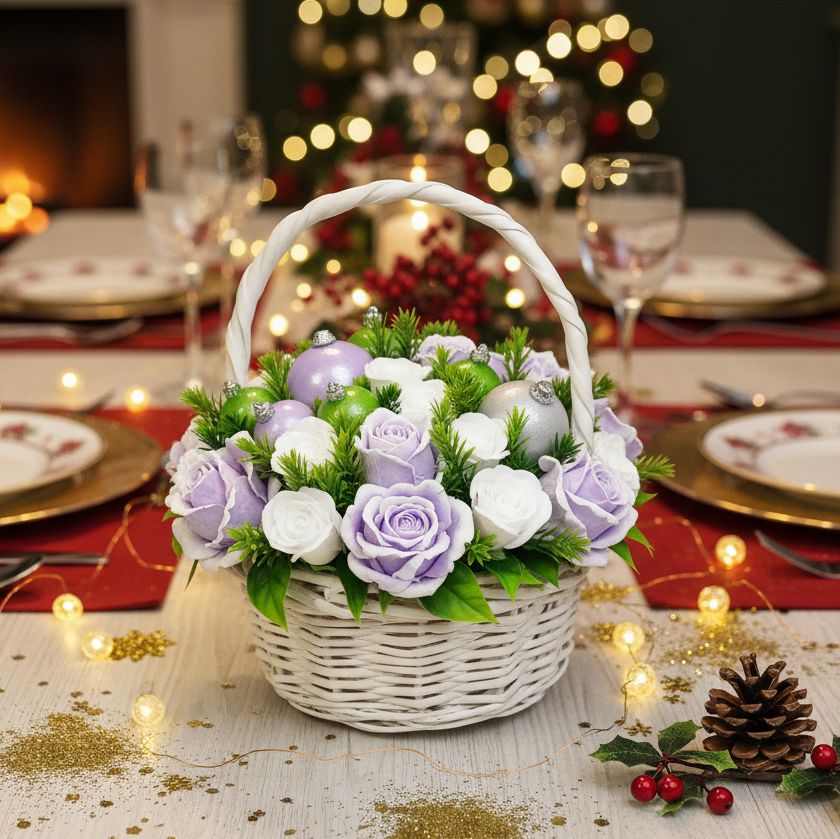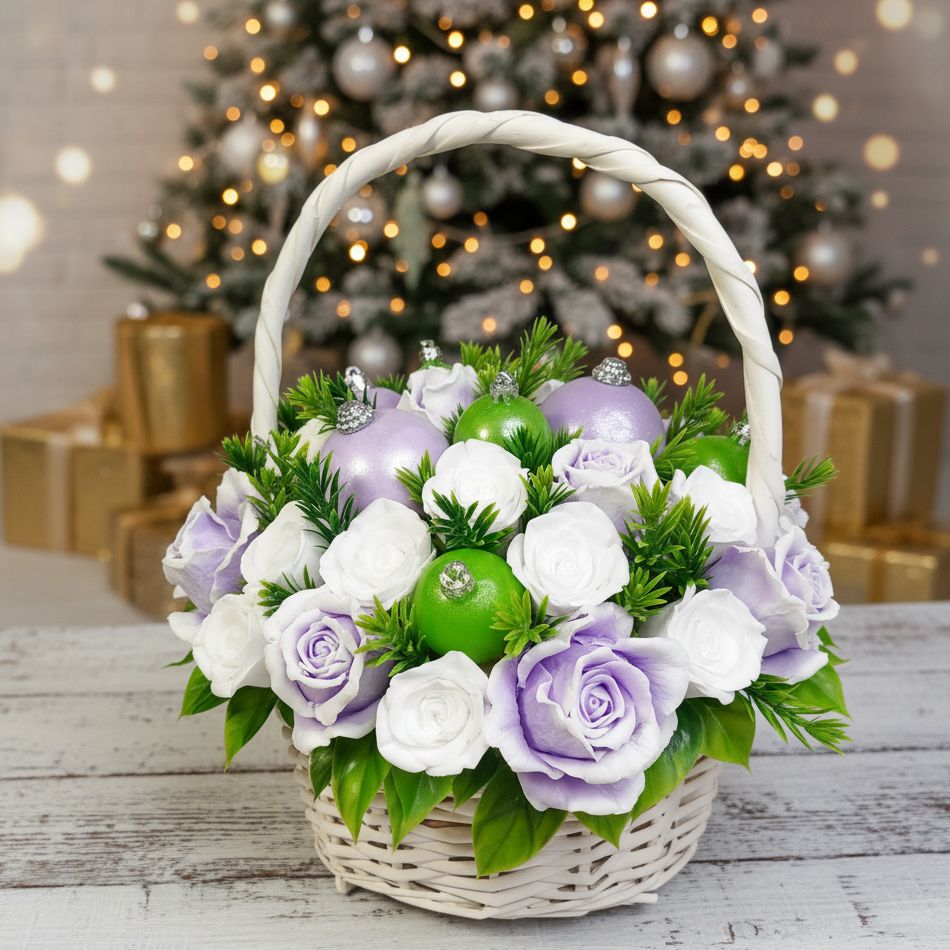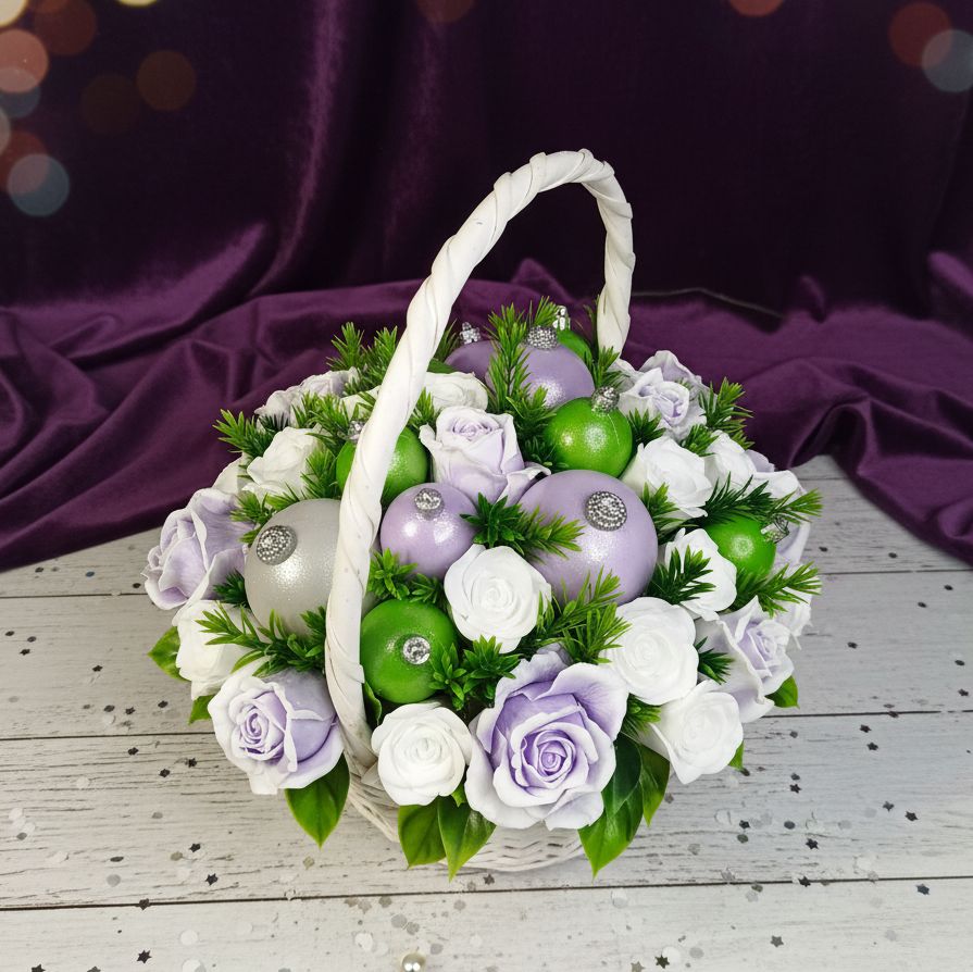 Атмосфера зимней сказки... Изящные лавандовые розы переплетаются с белоснежными бутонами и зеленью, напоминая о свежести морозного утра и ожидании чудес. Сияющие изумрудные и нежные лавандовые шары добавляют праздничного волшебства, создавая идеальный акцент для вашего новогоднего интерьера или незабываемого подарка.