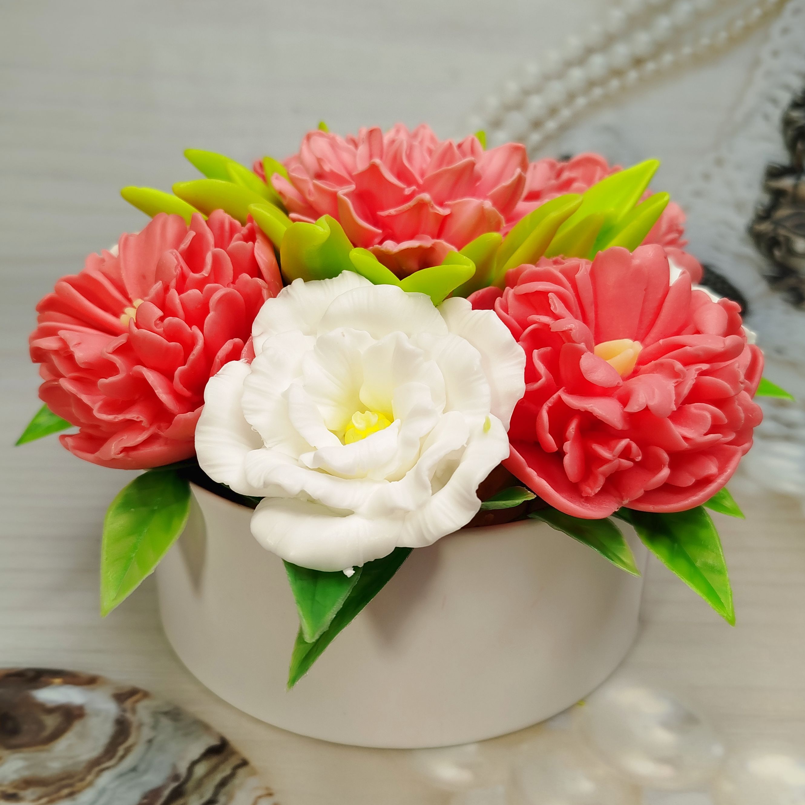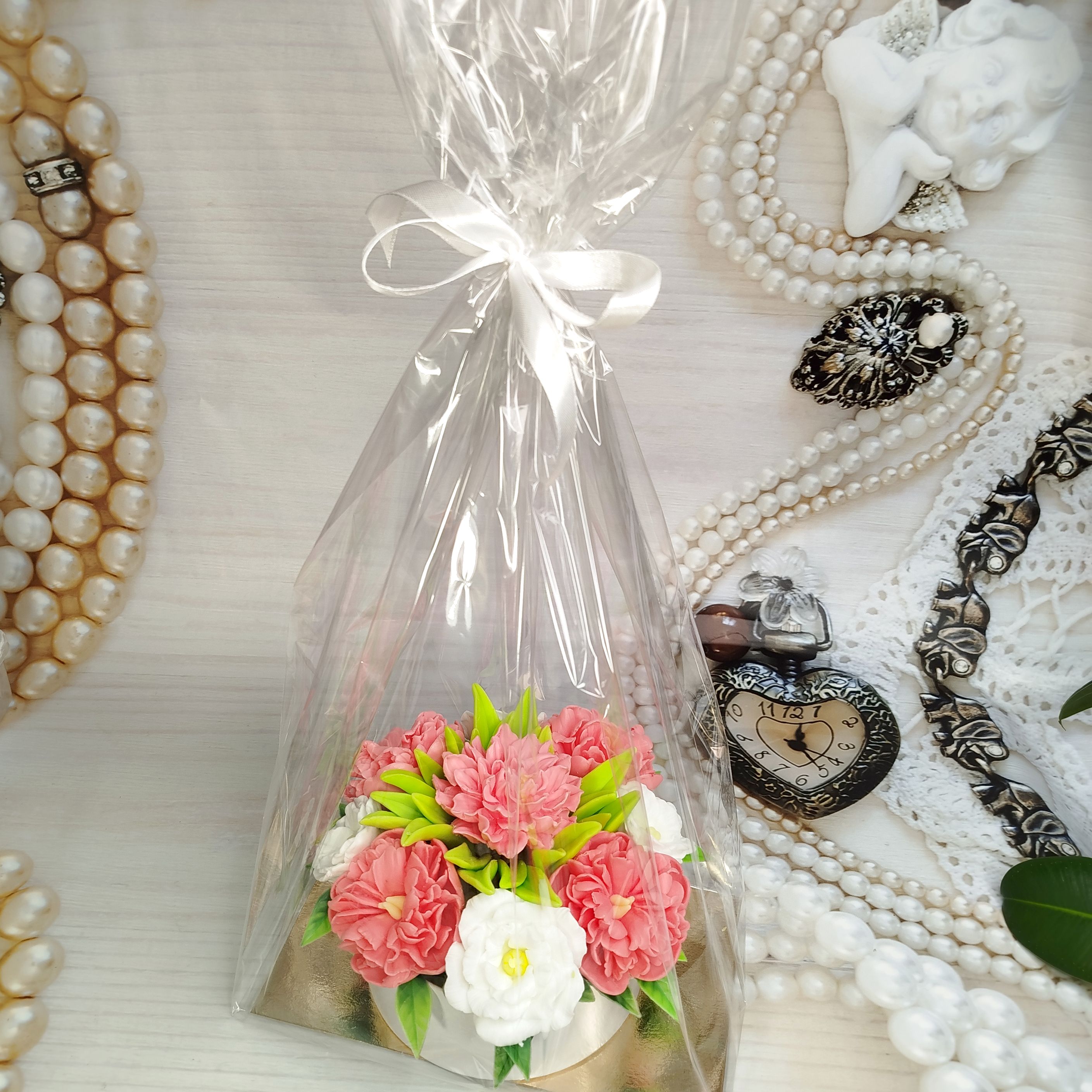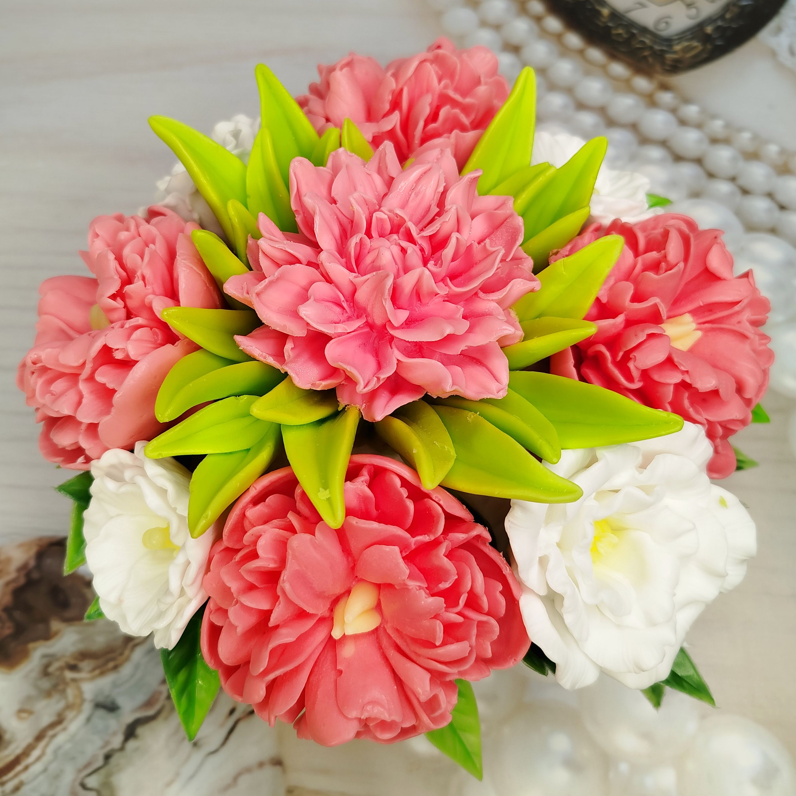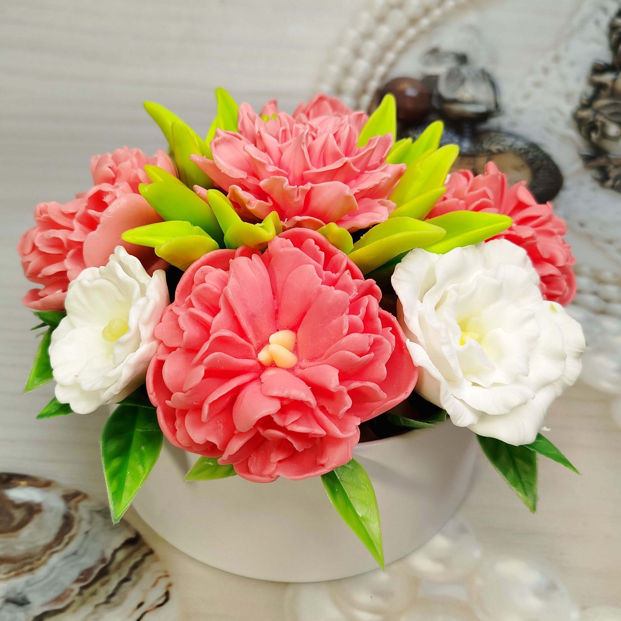 Этот удивительный букет из мыла. Пионы, эустомы и георгины, словно лепестки кувшинки, распустятся в вашем доме. Этот букет – идеальный подарок для ценителей прекрасного! Красота, которая не завянет! Закажите сейчас!