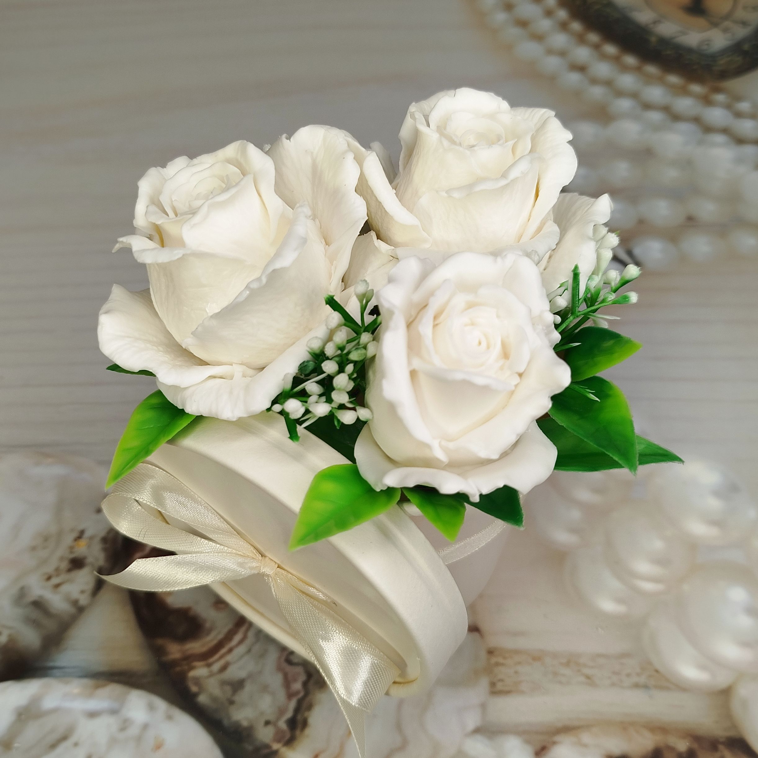 Три роскошные розы молочного цвета, словно звёзды на ночном небе, очаровывают своей красотой и изысканностью. Идеальный подарок для любимого человека, символизирующий светлые чувства и безмятежность.